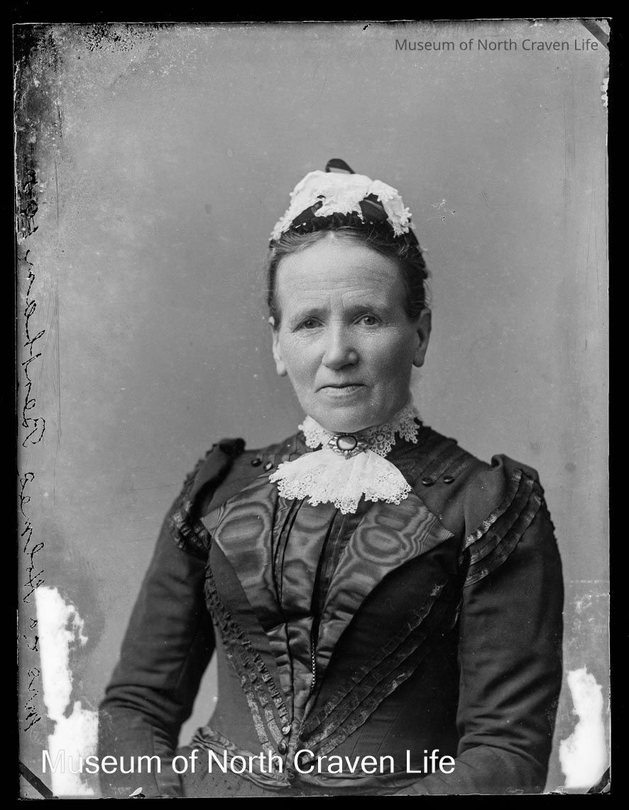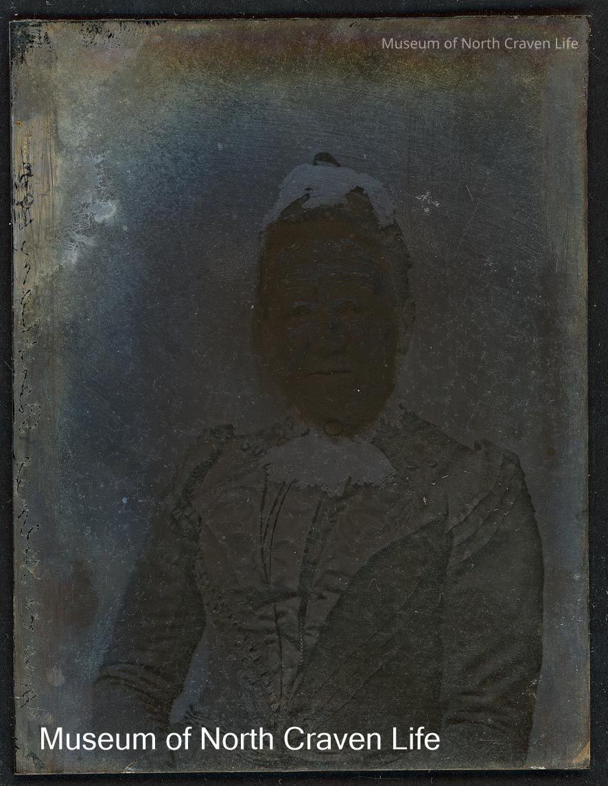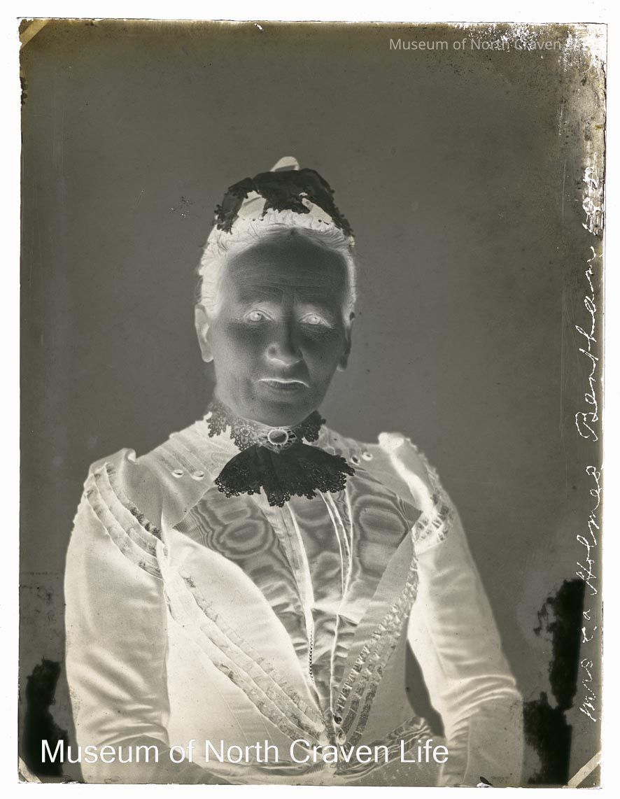 A quarter-plate gelatin silver glass negative. A half length seated studio portrait of Mrs A. Holmes of Bentham. 1905(?)Collection
