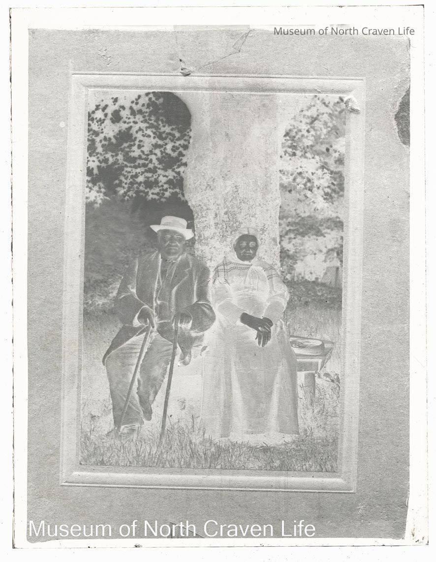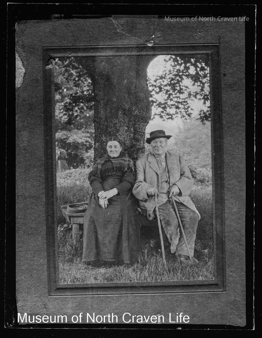A quarter-plate gelatin silver glass negative. An elderly couple are seated beneath a tree ; he holds two walking sticks, she wears a shawlCollection