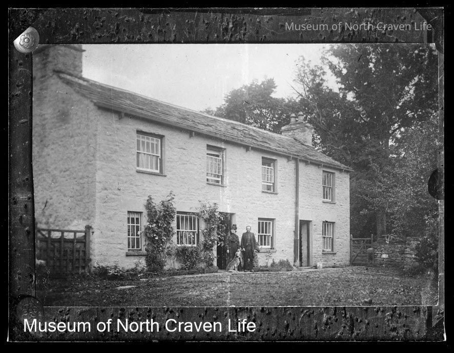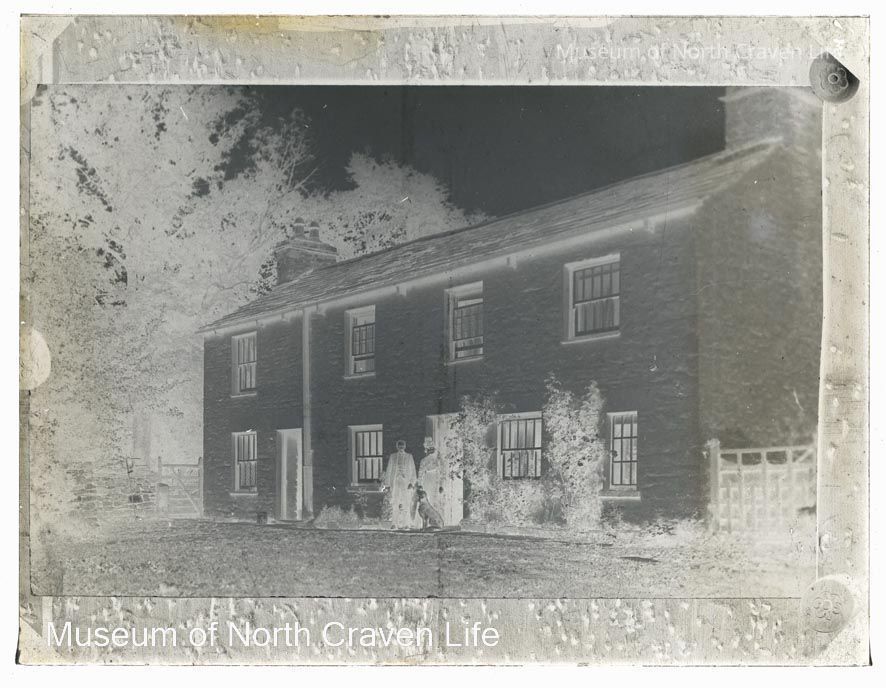 A quarter-plate gelatin silver glass negative. A couple stand at the door of a stone house, painted white, with a dog. The building is seen across a lawnCollection