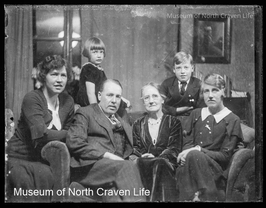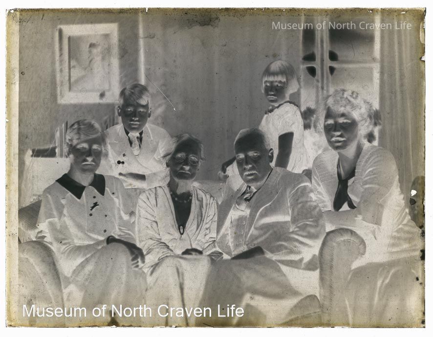 A quarter-plate gelatin silver glass negative. Three generations of the family are seated together on a sofa : Mabel, Rachel, Eddie, Elizabeth Ann (nee Holmes), Michael, Frances MaryCollection