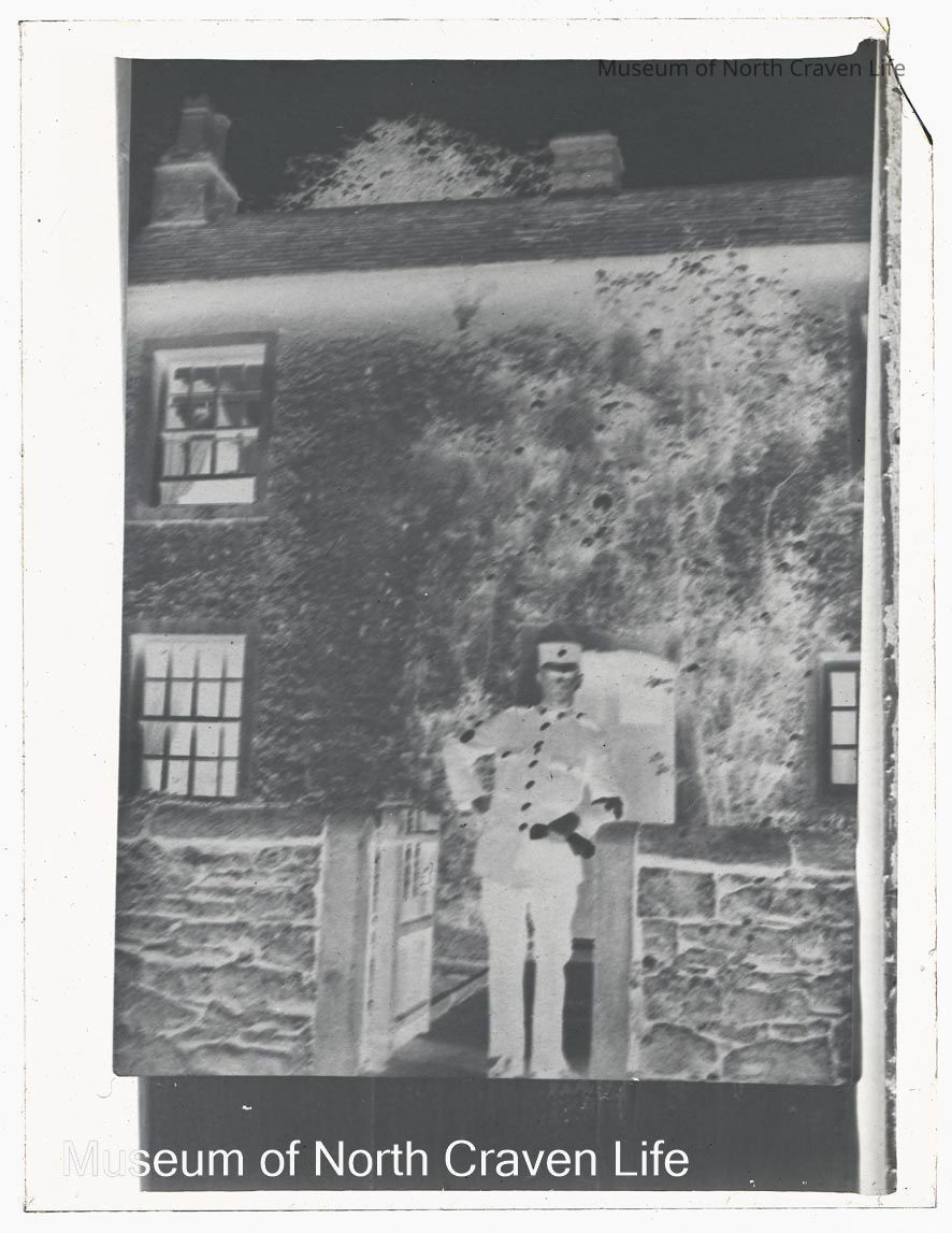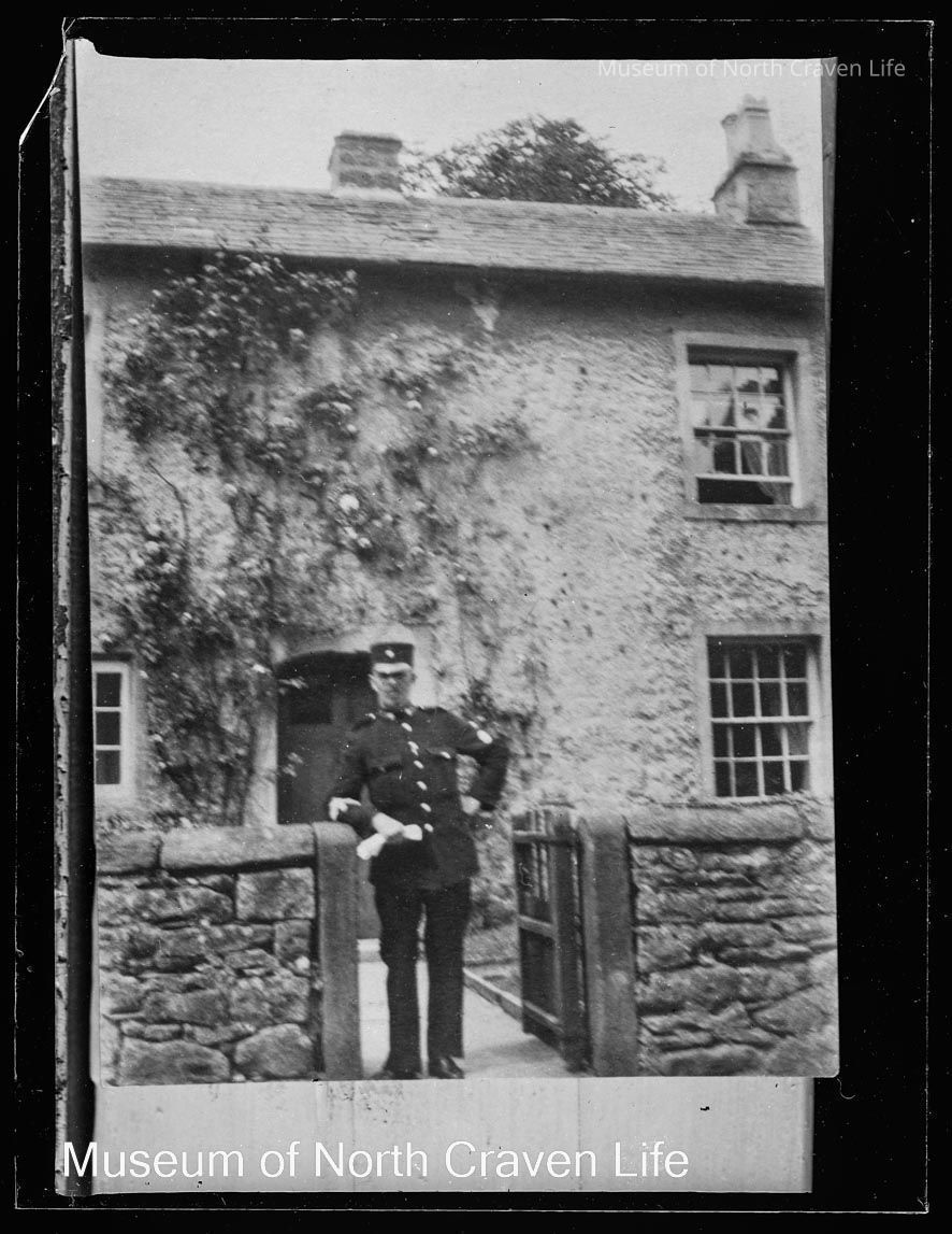 A quarter-plate gelatin silver glass negative. A policmen in uniform stands at a small gate in a stone wall in front of a house. He leans on the gate post and clutches a white objectCollection