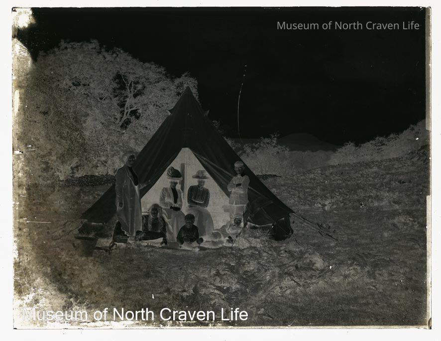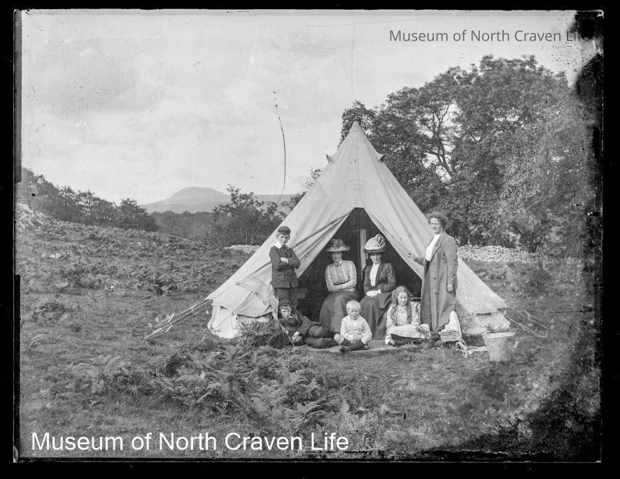 A quarter-plate gelatin silver glass negative. A view of a Bell Tent that has been erected in the countryside. In the background a peak rises up (Pen-y-Ghent?). Three women and four children pose inside and in front of the tent. Bracken is evident in the foregroundCollection
