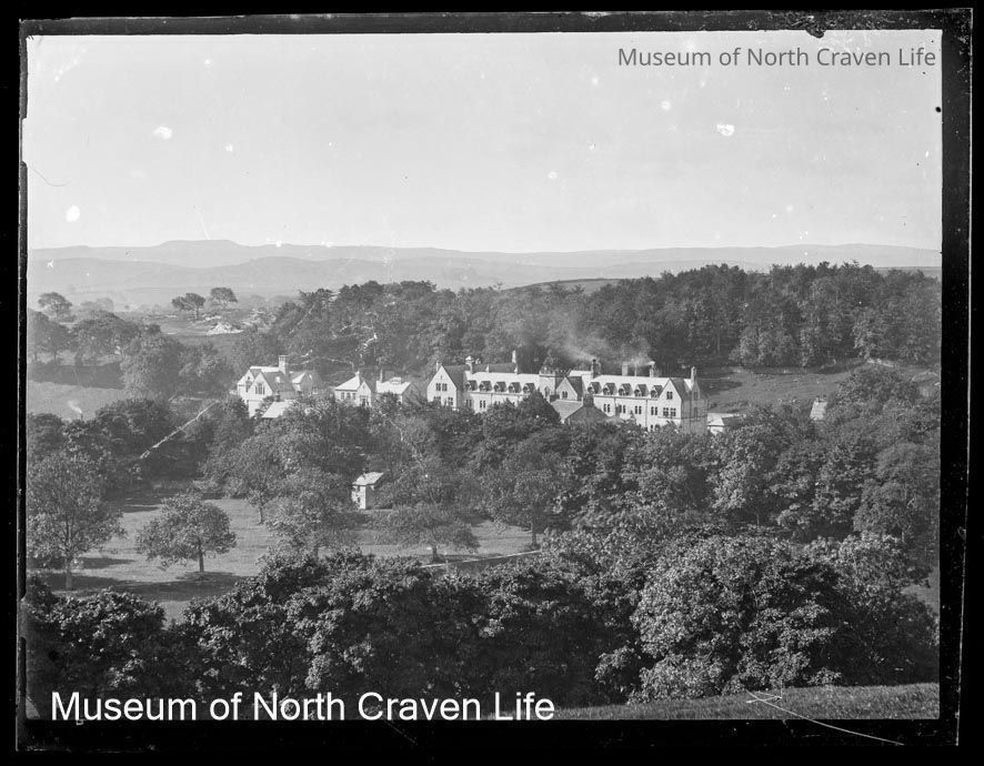 A quarter-plate gelatin silver glass negative. A view of Giggleswick School from a distance. The buildings are surrounded by mature treesCollection