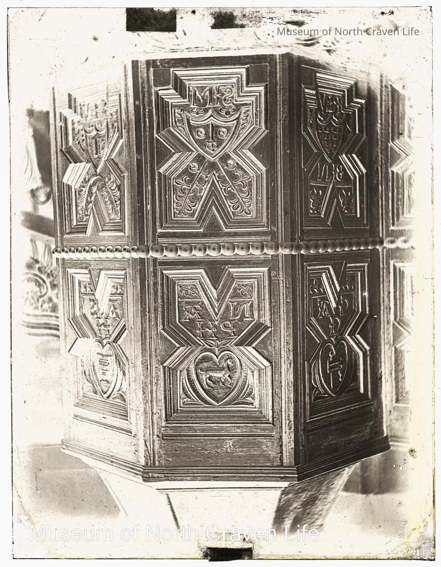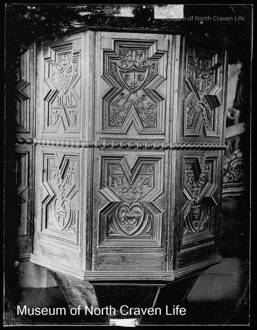 A quarter-plate gelatin silver glass negative. A view of a decorated wooden 17th century pulpit from the Church of St Alkelda, GiggleswickCollection