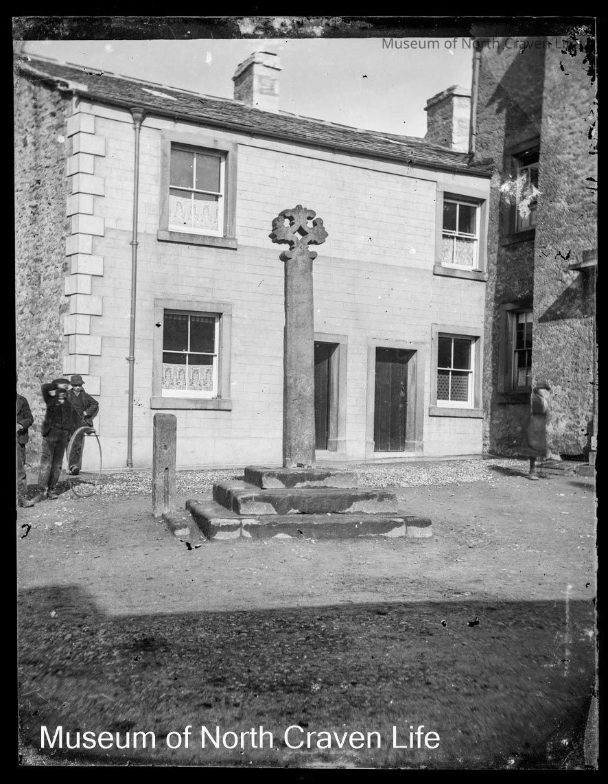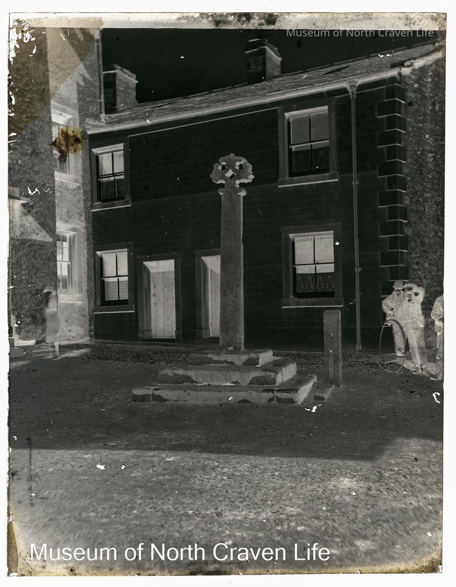 A quarter-plate gelatin silver glass negative. A view of Giggleswick market cross. Three men stand to the left of the cross, one holding a hoopCollection