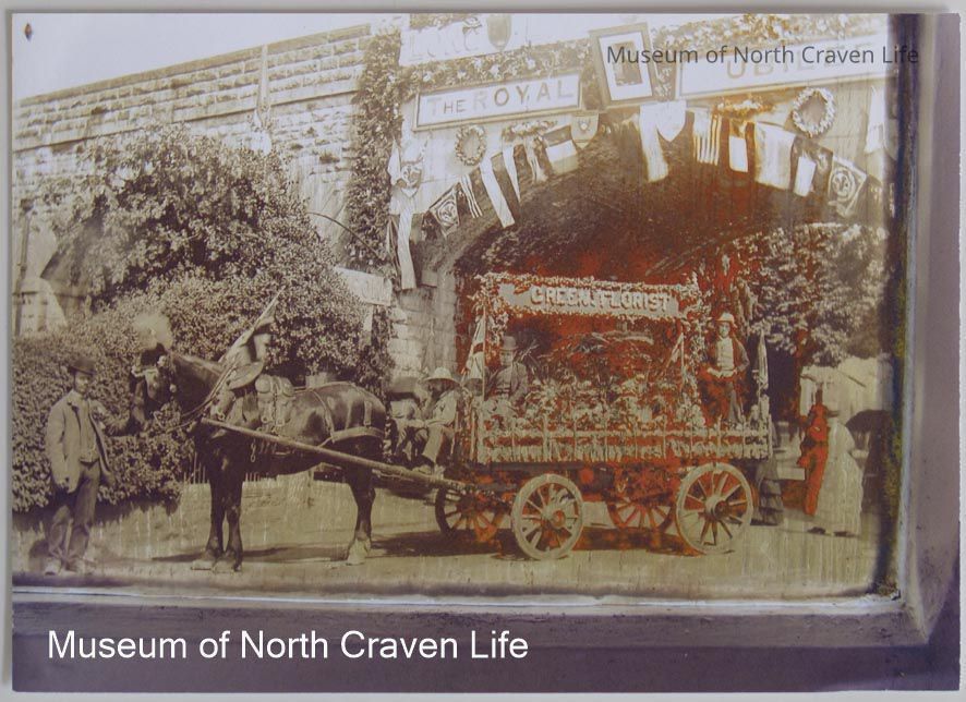 A gelatin silver photographic print. A view of Green the florist's horse and cart with flowers. A man holds the horse's head and three others are seated on the cart (the brother and father of Susan Green). The railway viaduct in the background is decorated for the Royal Jubilee.Collection