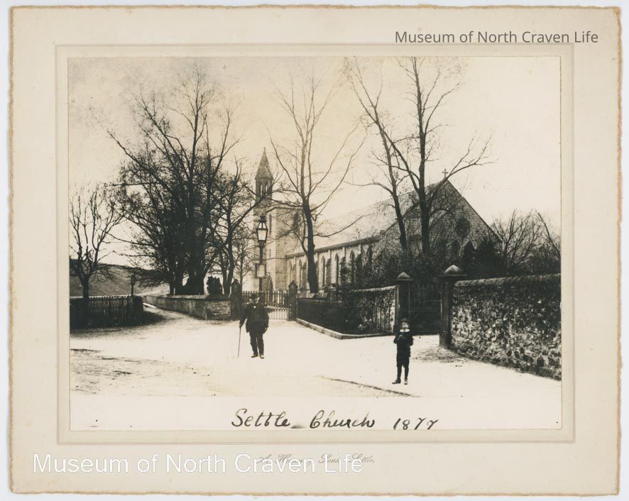 A gelatin silver photographic print. A view of the Church of Holy Ascension in Settle. A man and a boy stand in the road in front of the church. The print is dated 1877 and mounted on cardCollection