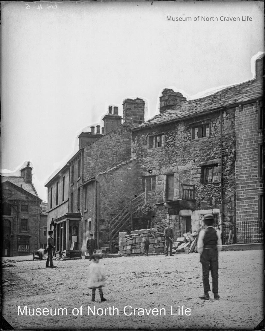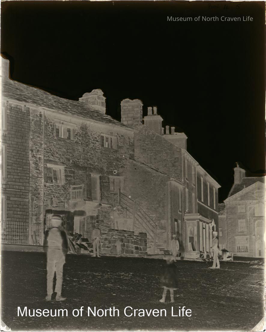 A dry plate collodion? negative. A view of the back of the Shambles. A group of children are playing in the street. The Shambles are located on the north side of Settle Market Place, orginially built c. 1780 and modified in 1888-89. A grade II listed building