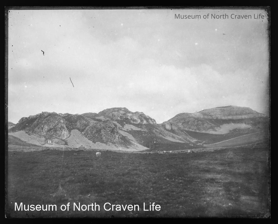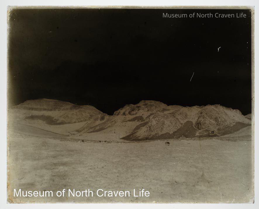 A gelatin silver glass negative. A view of Attermire Scars with cattle in the foreground and shooting ranges at the base of the scarsCollection