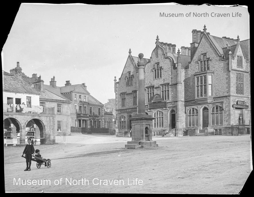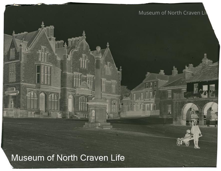 A 93 x 74mm b/w gelatin silver glass negative. A view of Settle Market Square ; a boy with a barrow appears to the left in front of the Shambles (second story)Collection