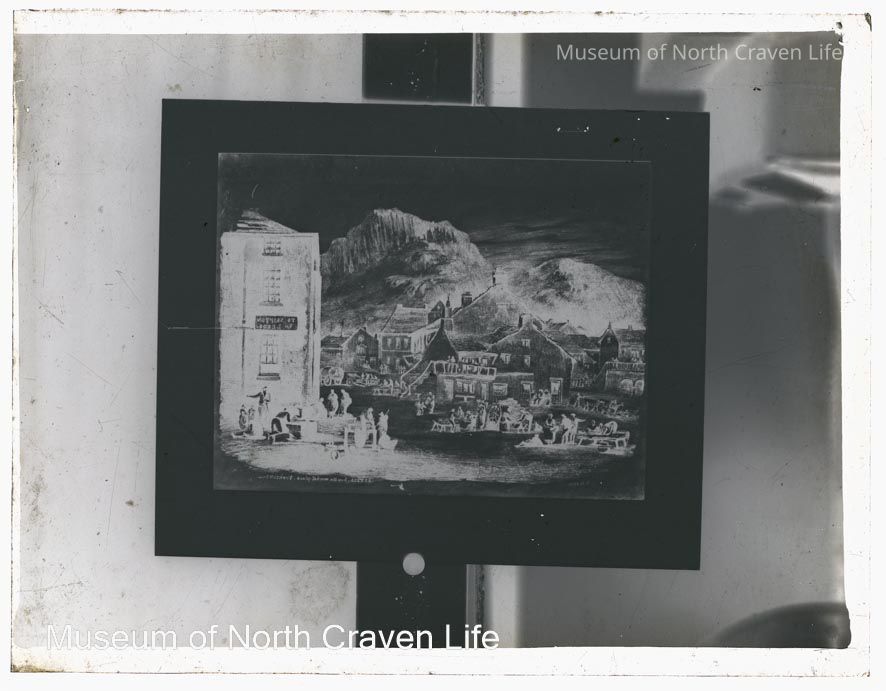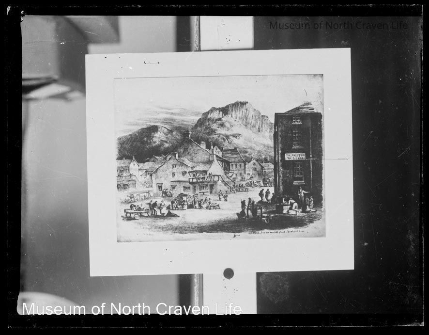 A gelatin silver glass negative. A view of a photograph of an etching on an easel. The etching is titled "Settle from the Market Place, Yorkshire." Dated possibly 1822?Collection