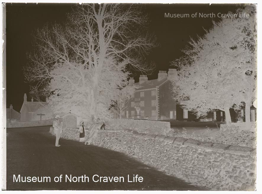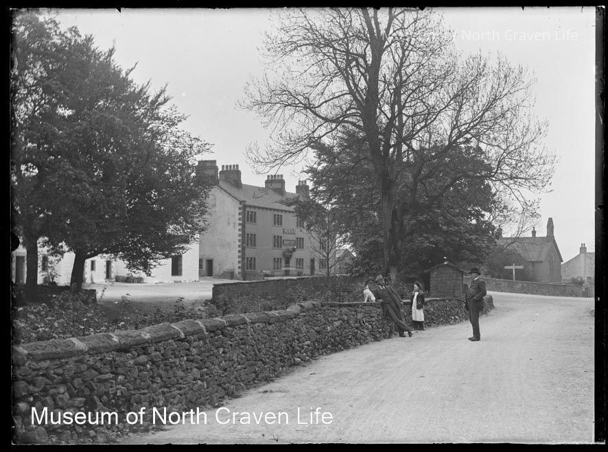 A gelatin silver glass negative. A view of the New Inn (Harry Boys) in Clapham from the bridge. A dog sits on the parapet of the bridge with a man leaning against it. Beside him stands a young girl with a second man in bowler hat, conversingCollection