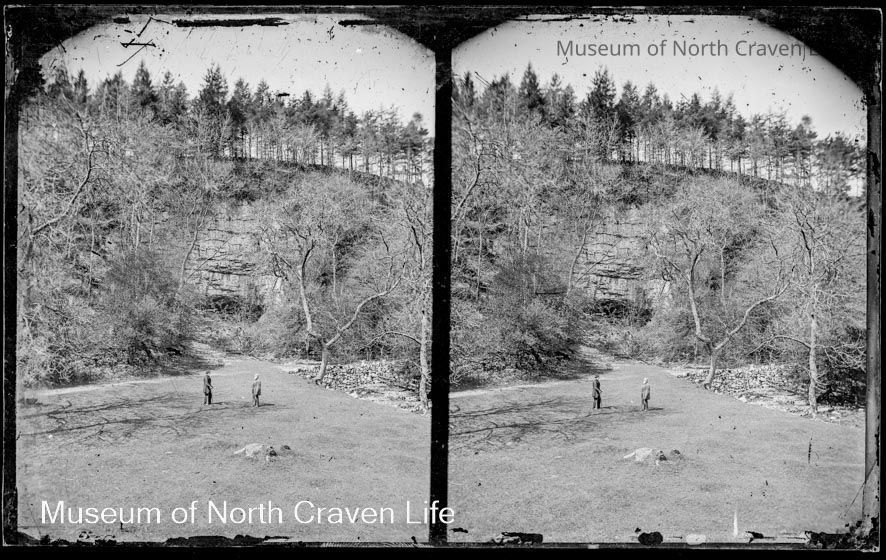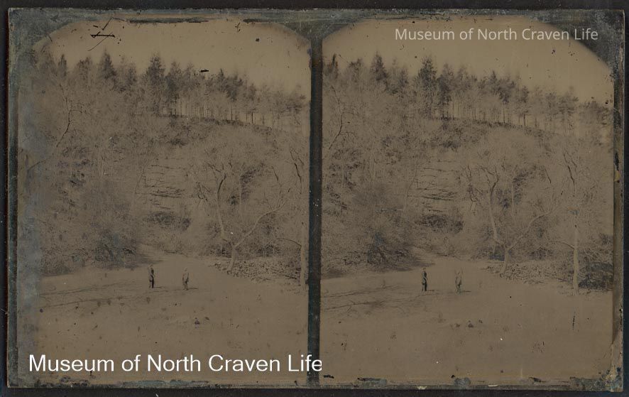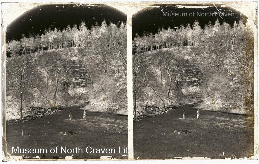 A full-plate wet-collodion negative. A stereoscope view of the entrance to Ingleborough Cave in Clapham Woods. Two men stand on the grass in front of a cliff face partly obscured by trees. The entrance to the cave is visible at the base of the cliff.Collection