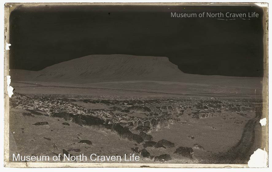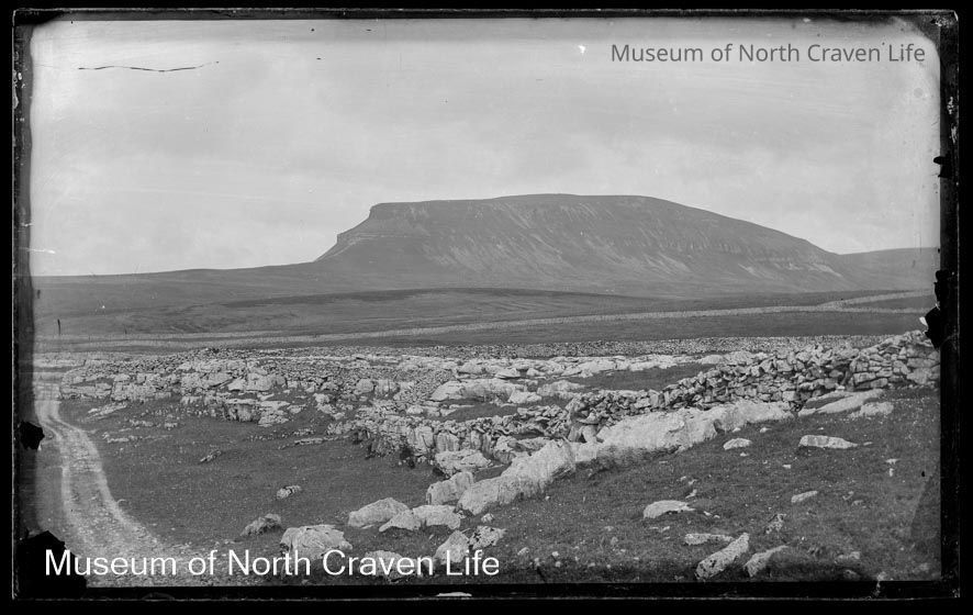 A wet plate collodion negative. A view of Pen-y-ghent across open fields. A limestone pavement bordered by a dry stone wall appears in the foreground. It is the lowest of Yorkshire's Three Peaks at 2,277 feet (694 m). It lies 1.9 miles (3 km) east of Horton in RibblesdaleCollection