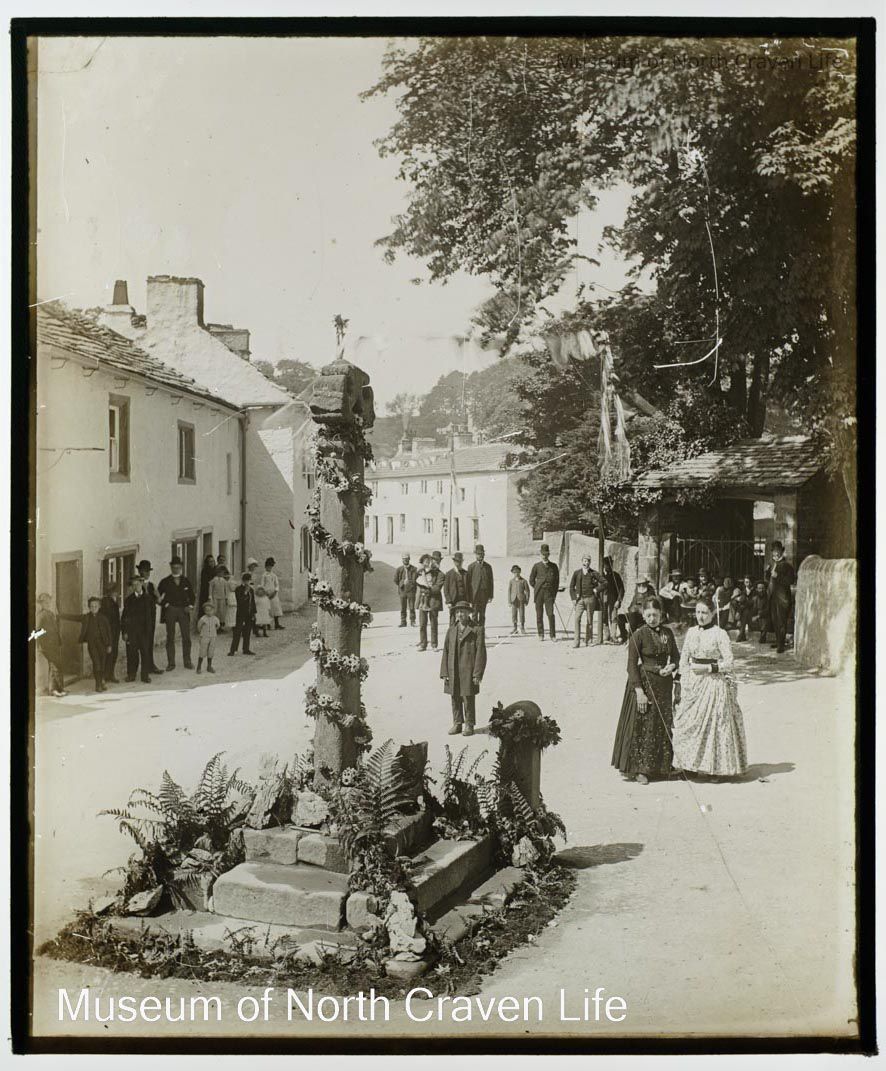 A late 20th century gelatin silver print. A view of Giggleswick Cross with flowers and the church gate. Groups of people stand aroundCollection