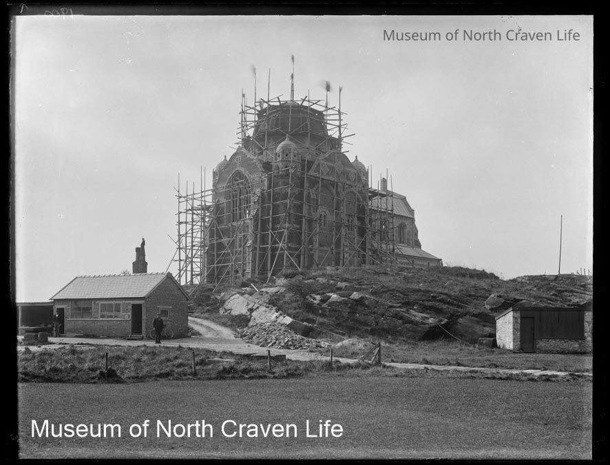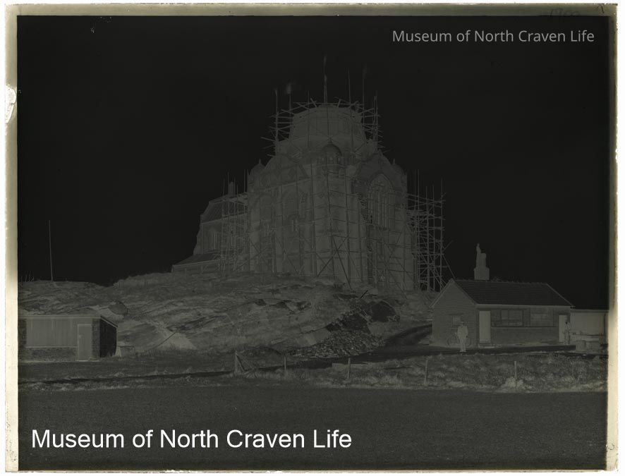 A full-plate gelatin silver glass negative. An image of the construction of Giggleswick School Chapel. The building is sheathed in scaffolding. A man stands in the foregroundCollection