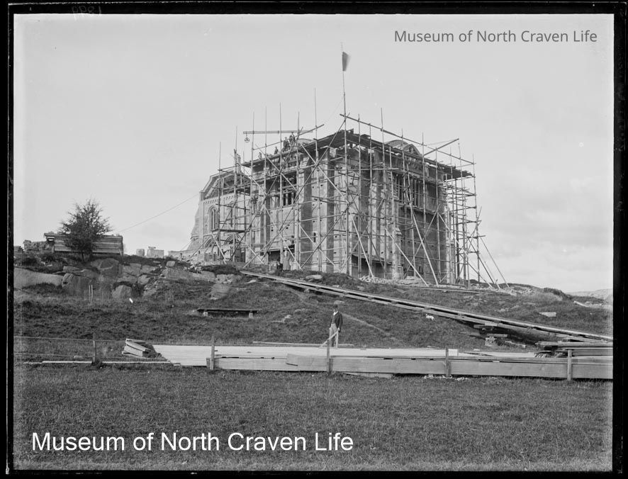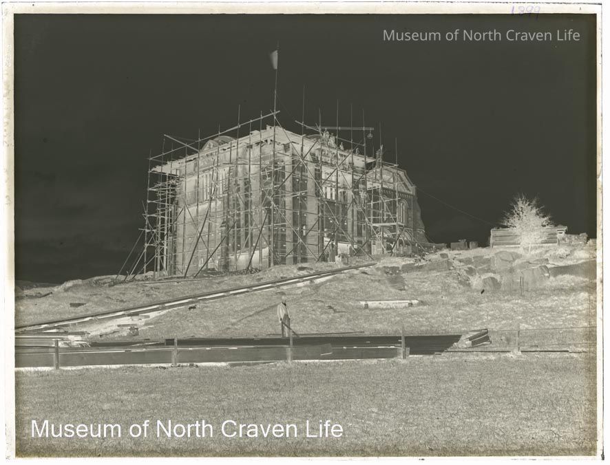 A full-plate gelatin silver glass negative. A close-up image of the construction of Giggleswick School Chapel. The building is sheathed in scaffolding. A man stands in the foregroundCollection