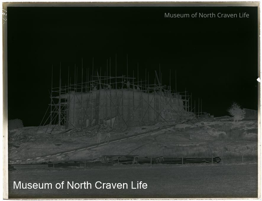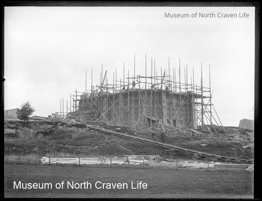 A full-plate gelatin silver glass negative. An image of the construction of Giggleswick School Chapel (early stages). The building is sheathed in scaffoldingCollection