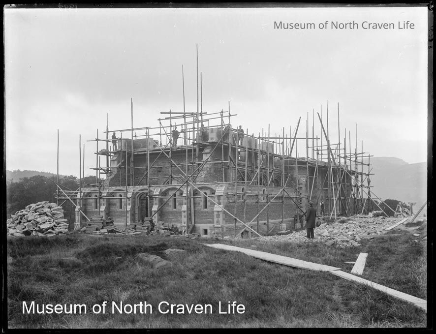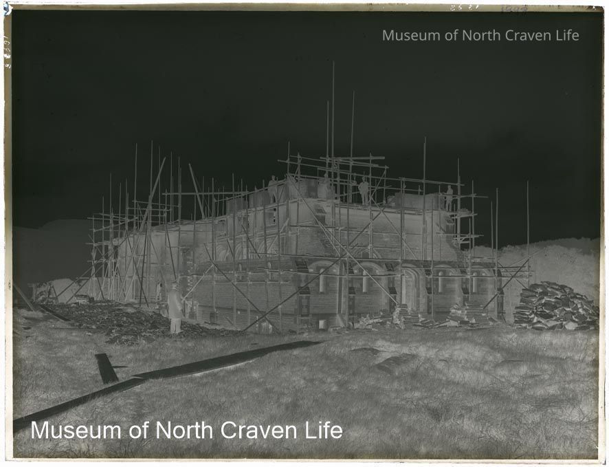 A full-plate gelatin silver glass negative. An image of the construction of Giggleswick School Chapel (early stages). The building is sheathed in scaffolding. A man stands in the foregroundCollection