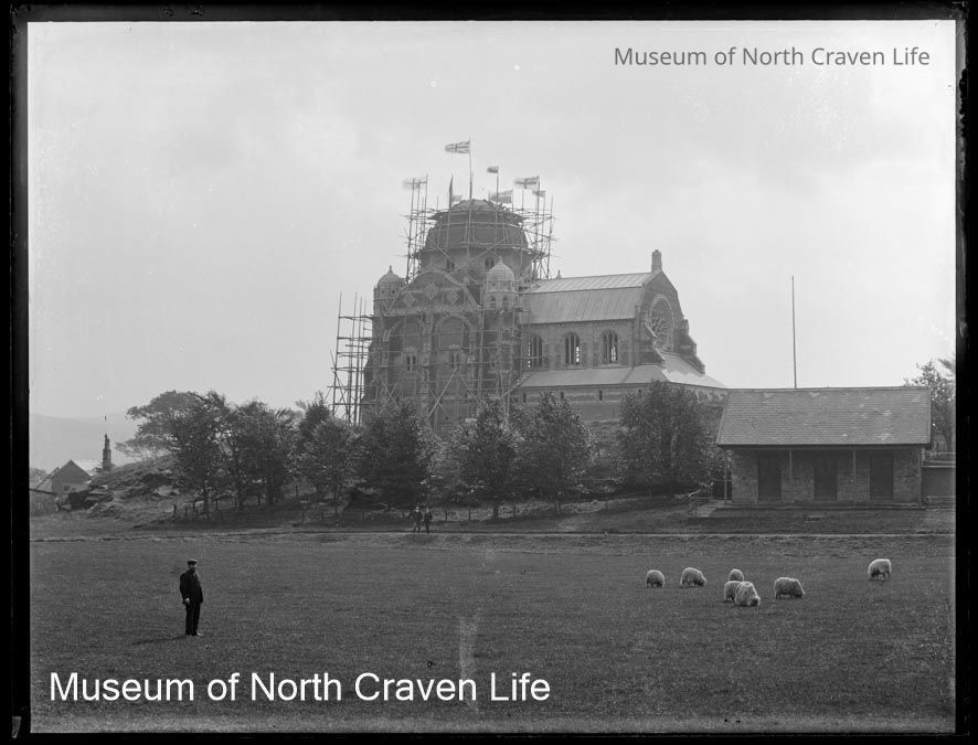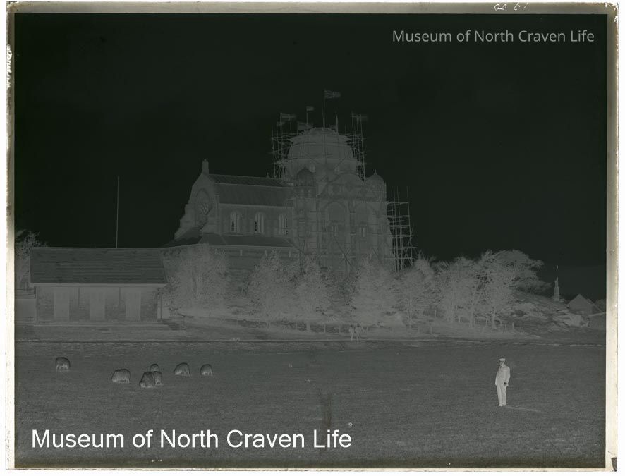 A full-plate gelatin silver glass negative. An image of the construction of Giggleswick School Chapel. The building is sheathed in scaffolding. A man stands in the foreground where some sheep are grazingCollection