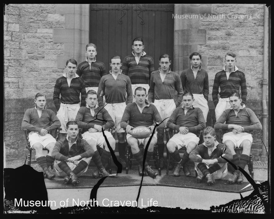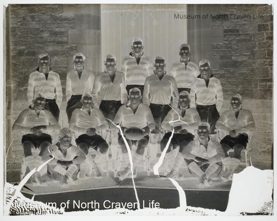 A gelatin silver glass plate negative. A group portrait of Giggleswick School Rugby Team 1935-36Collection