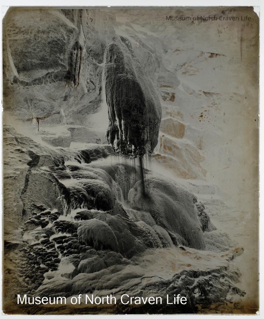 A gelatin silver glass plate negative. A view of a rock formation inside Ingleborough Cave called the "Showerbath".Collection
