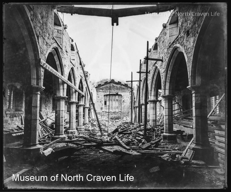 A gelatin silver glass plate negative. A view of the interior of the church of St Alkelda in Giggleswick during extensive restoration 1890-92Collection