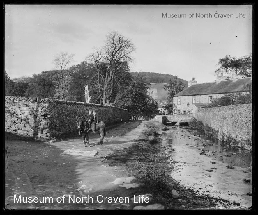 A gelatin silver glass plate negative. A view of Tems Side, Giggleswick. Two boys are sitting on a donkey with a third standing beside themCollection