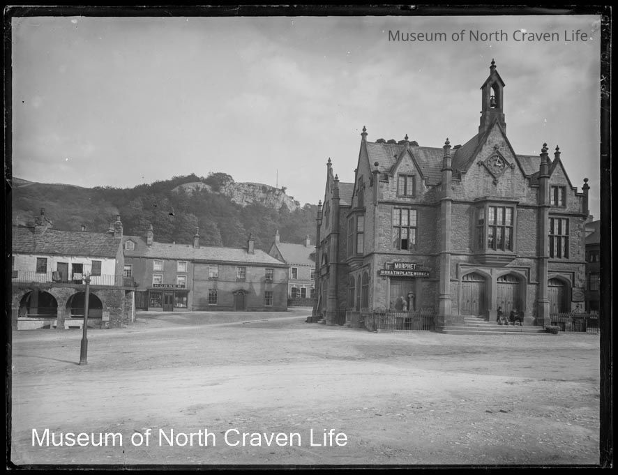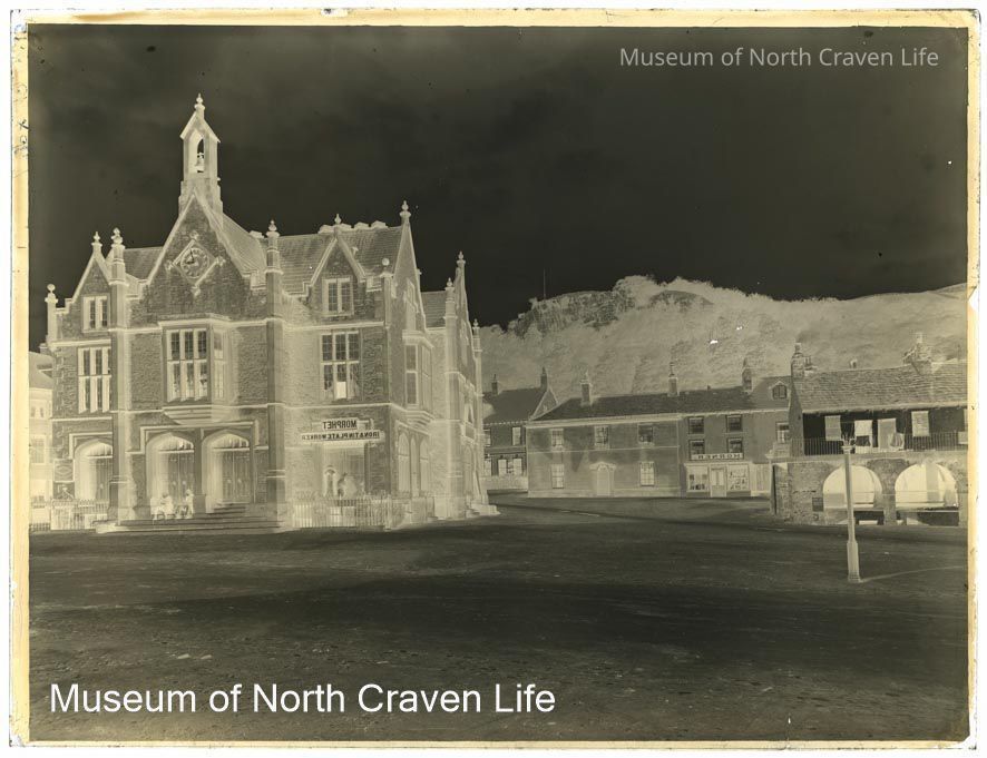 A full-plate gelatin silver glass negative. A view of Settle Market Place. The Town Hall stands on the right with the Shambles to the left (single storey)Collection