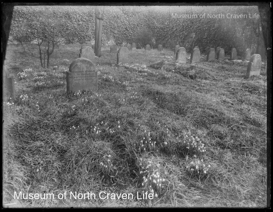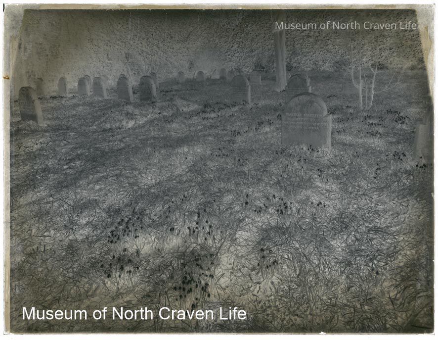 A full-plate gelatin silver glass negative. A view of a Quaker ? graveyard with a series of gravestones standing in long grass, dotted with snowdropsCollection