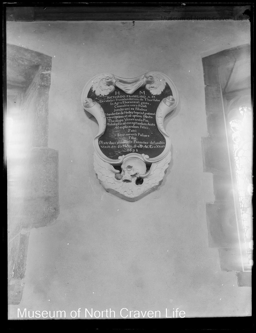 A full-plate gelatin silver glass negative. A view of a memorial to Richard Frankland in St Alkelda's church, Giggleswick (1698).Collection