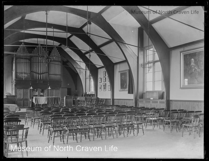 A full-plate gelatin silver glass negative. A view of the Memorial Library in Giggleswick School. Organ pipes behind a dais with a lectern appear in the backgroundCollection