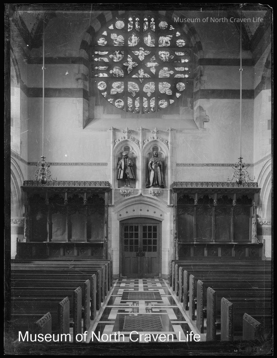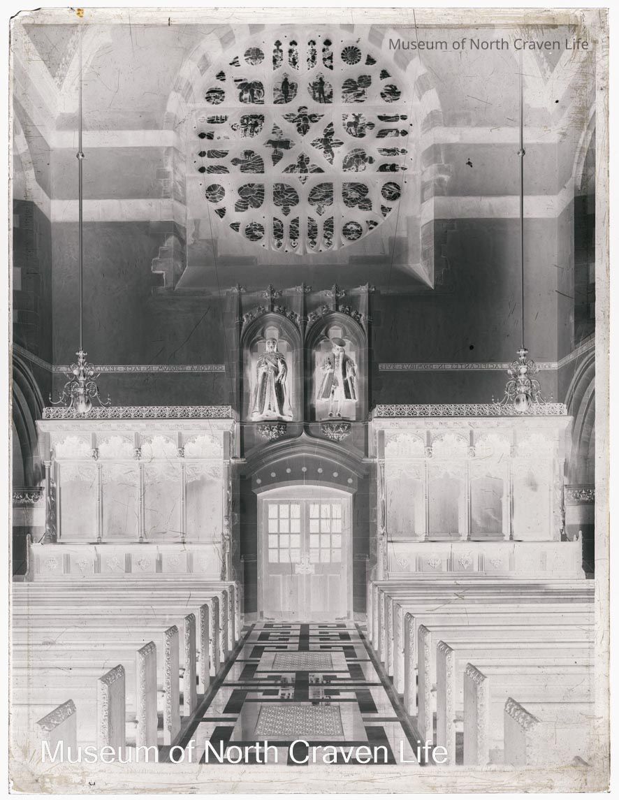 A half-plate gelatin silver glass negative. A view of the interior of Giggleswick School Chapel with the bronze statutes of Edward VI and Queen Victoria by G. Frampton in niches above the nave entrance. The stained glass west window by Jackson is aboveCollection