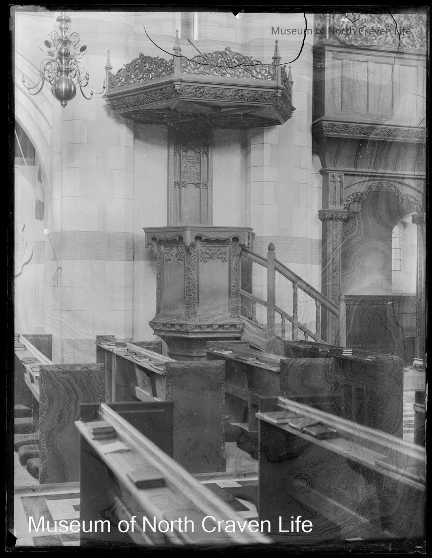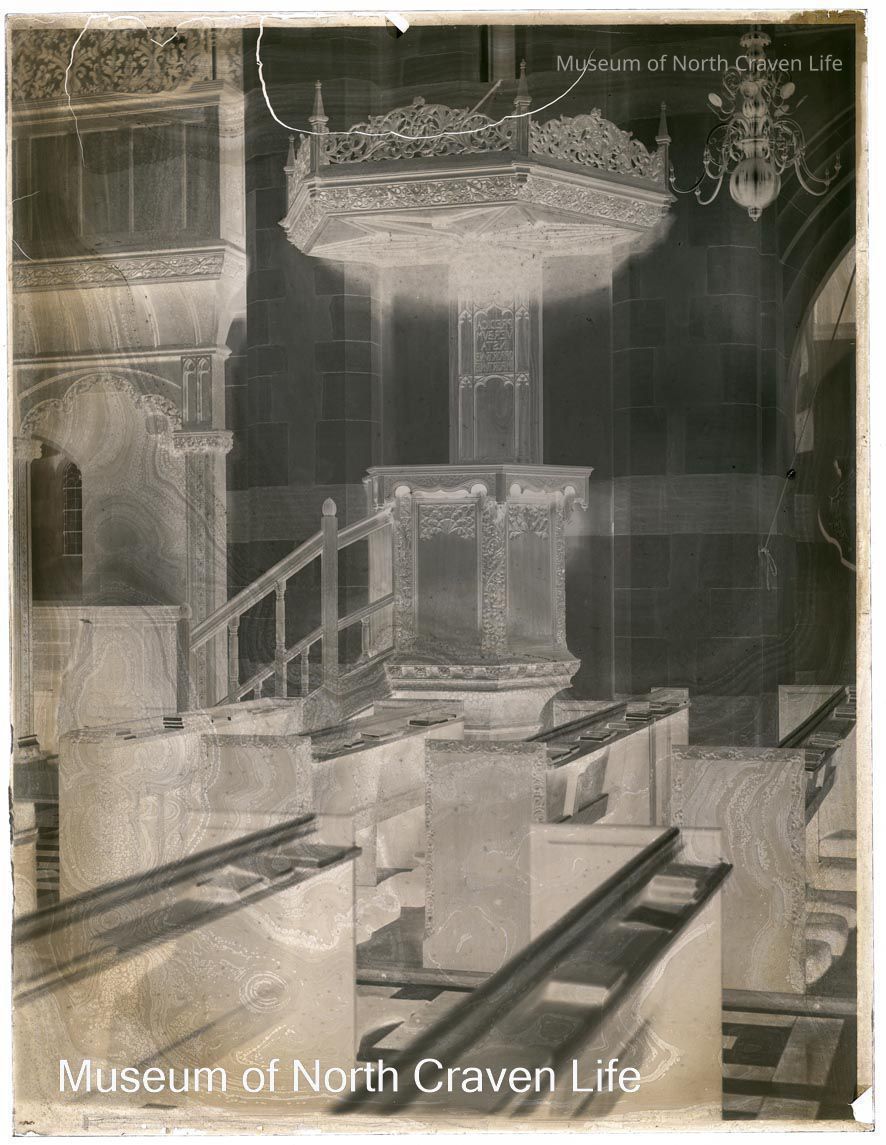 A half-plate gelatin silver glass negative. A view of the interior of Giggleswick School Chapel : the decorated pulpit and pewsCollection