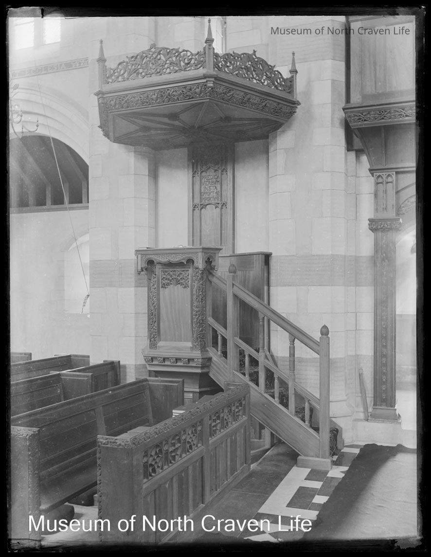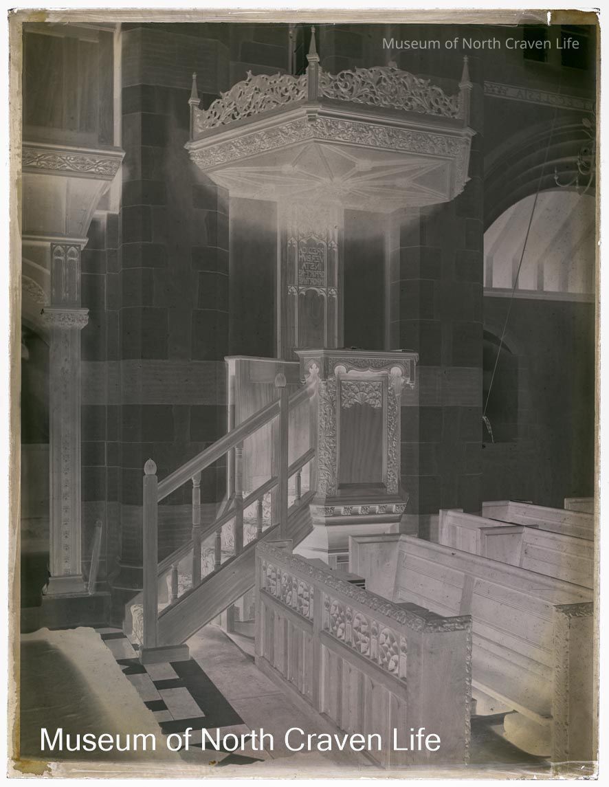 A half-plate gelatin silver glass negative. A view of the interior of Giggleswick School Chapel : the decorated pulpit and pewsCollection