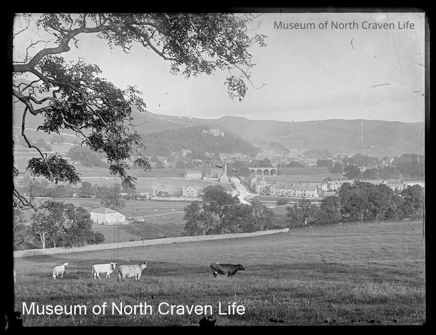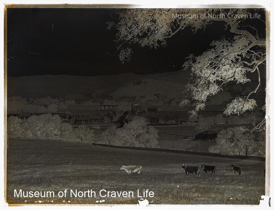 A full-plate gelatin silver glass negative showing a view of Settle from the High School. Cattle graze in a field in the foreground ; the viaduct is visible in the backgroundCollection