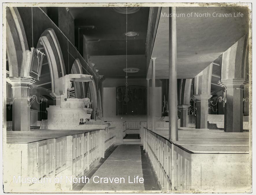 A full-plate gelatin silver glass negative. An interior view of the nave looking to the east and the altar of St. Alkelda's Church, Giggleswick. The pulpit is surrounded by box pews and there is a gallery along the left side of the nave.Collection