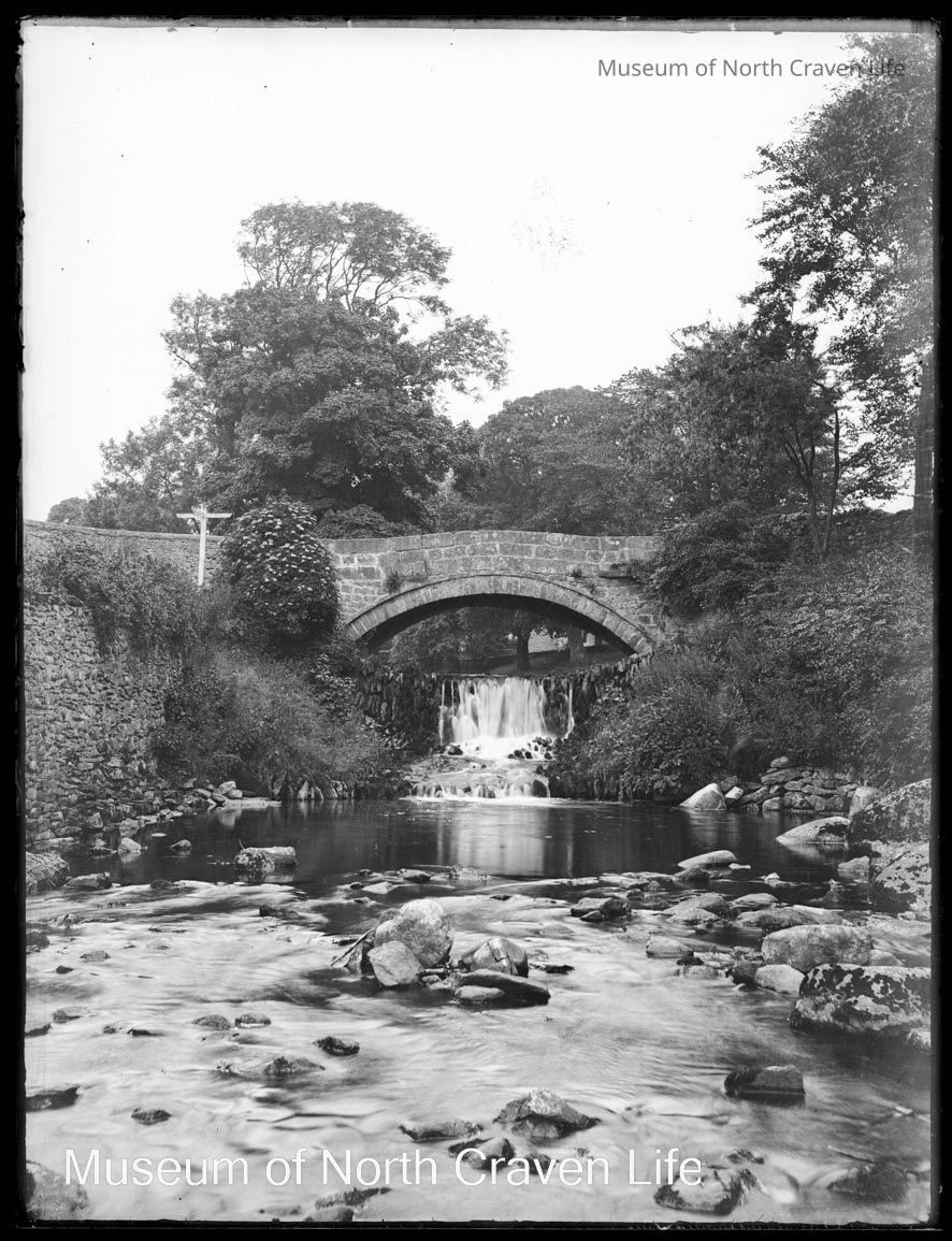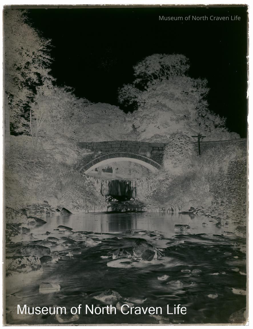 A full-plate gelatin silver glass negative. A view upstream towards the single-span bridge at Clapham. In the foreground Clapham Beck flows overs rocks. Beneath the arch of the bridge, the river cascades in a small waterfallCollection