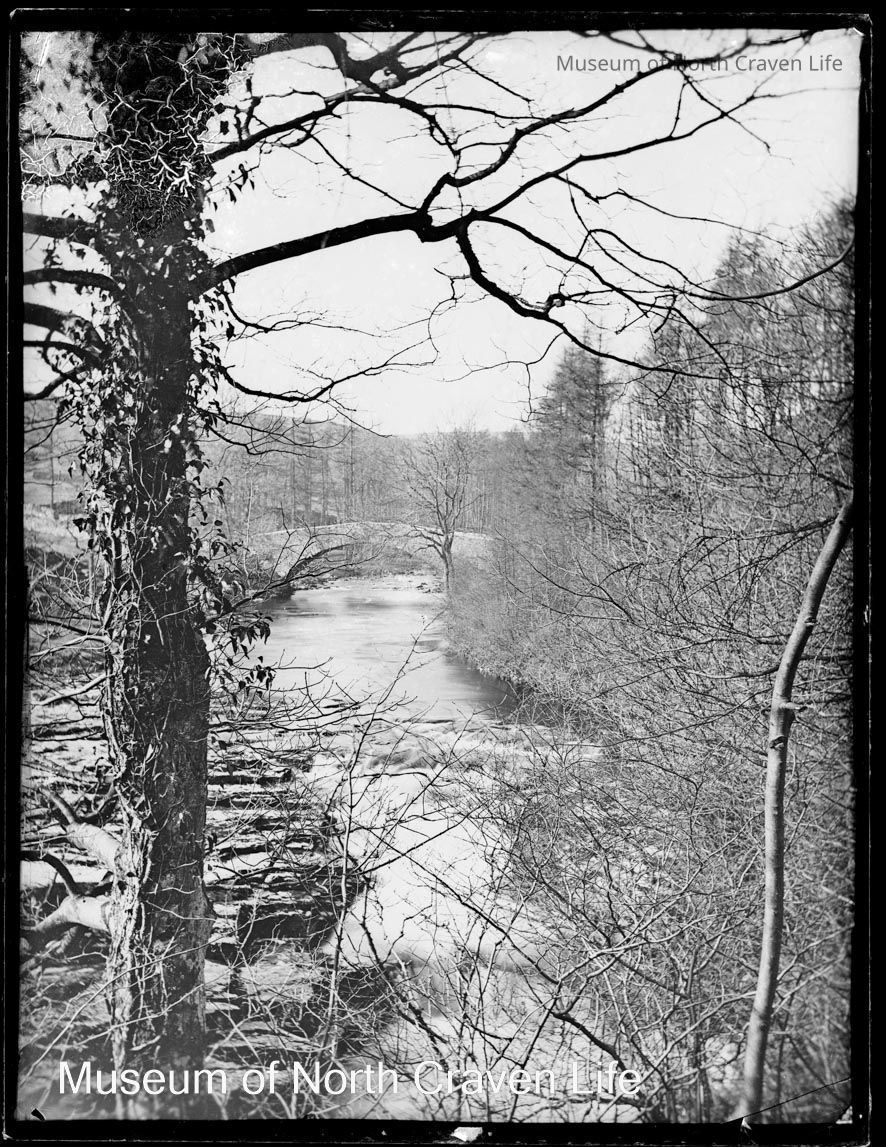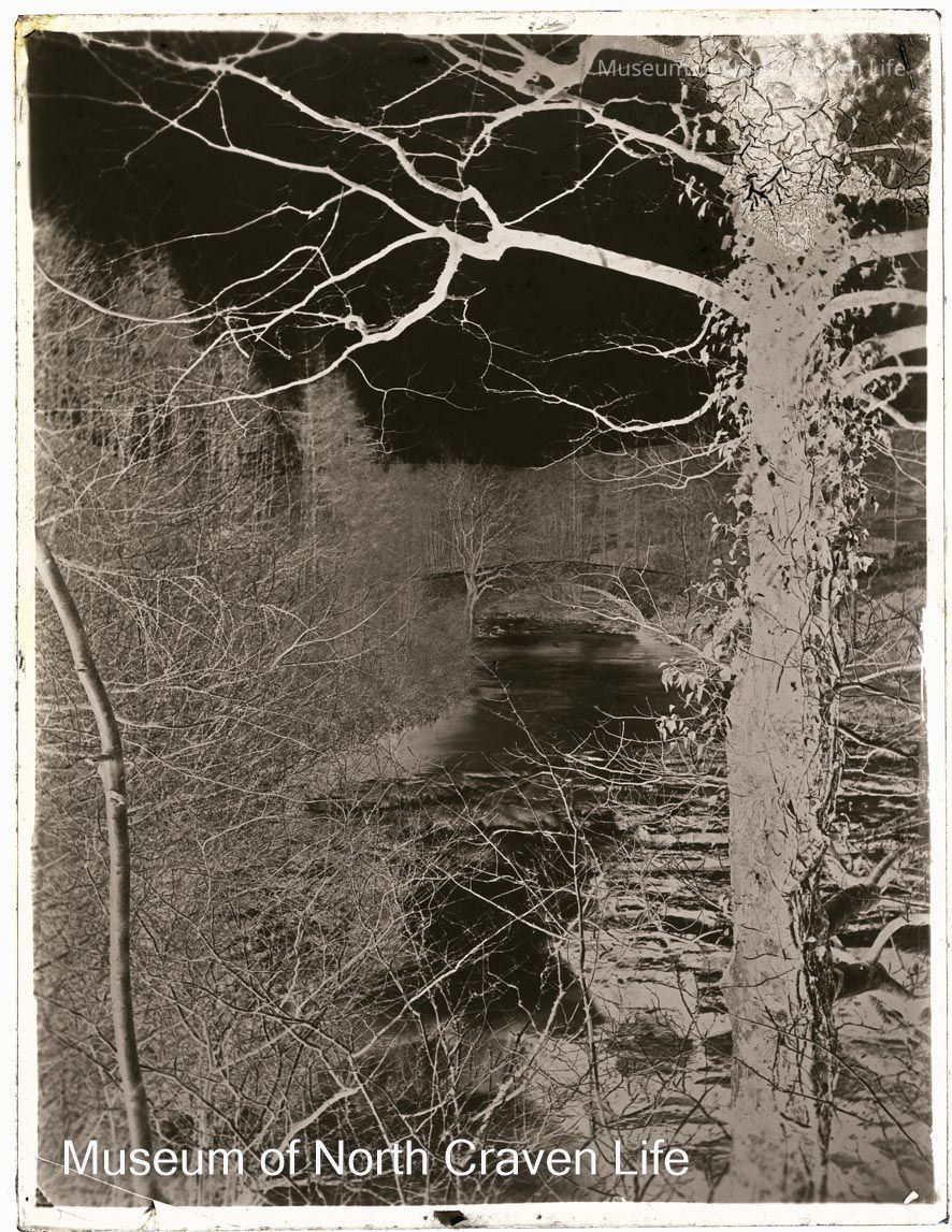 A full-plate gelatin silver glass negative. A view down the River Ribble towards Stainforth Bridge, a 17th century arched packhorse bridge which gives access to Stainforth Force. A tree stands to the left in the immediate foregroundCollection