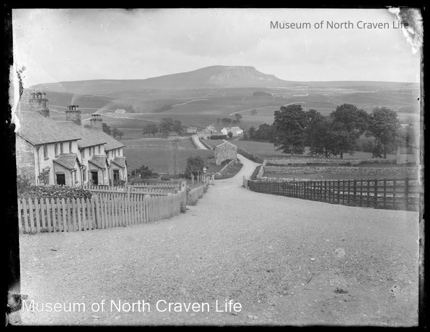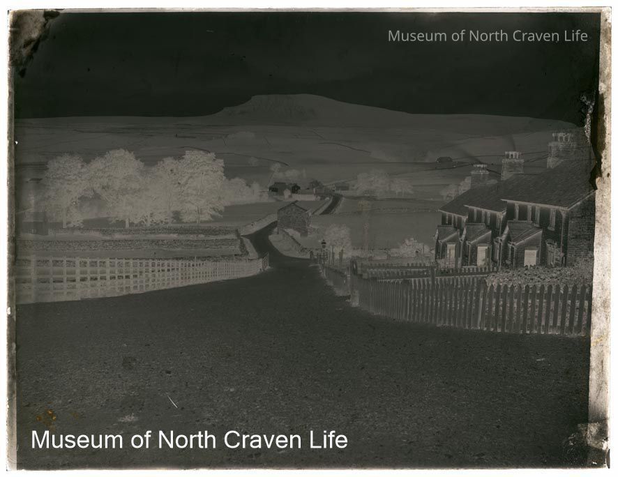 A full-plate gelatin silver glass negative. A view of Horton along Station Road. Pen-y-ghent rises up in the centre backgroundCollection