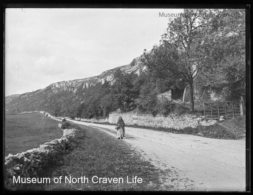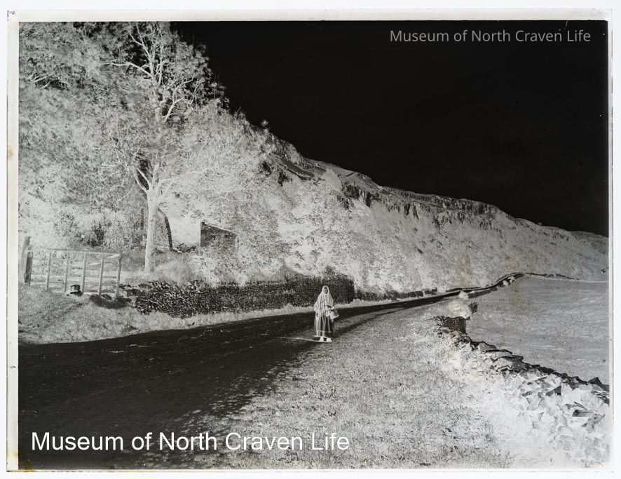 A full-plate gelatin silver glass negative. A view along Buckhaw Brow looking north-west (approximately at the entrance to the 20th century golf club). An elderly woman, wearing a full head shawl and carrying a basket over her right forearm, stands facing the camera in mid-groundCollection