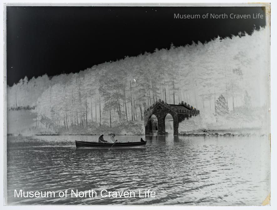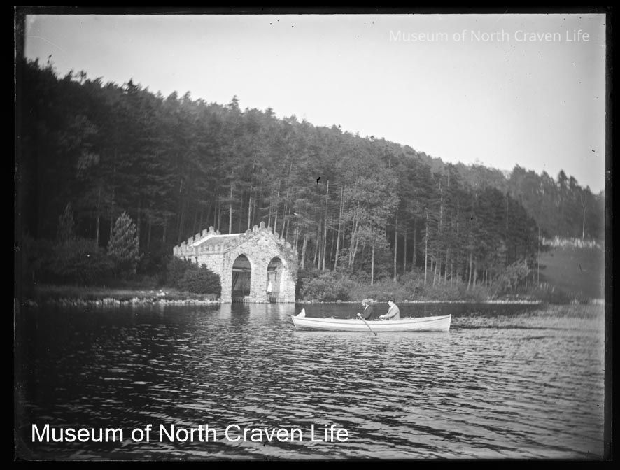 A full-plate gelatin silver glass negative showing two men in a rowing boat on the lake in front of Malham Tarn boathouseCollection