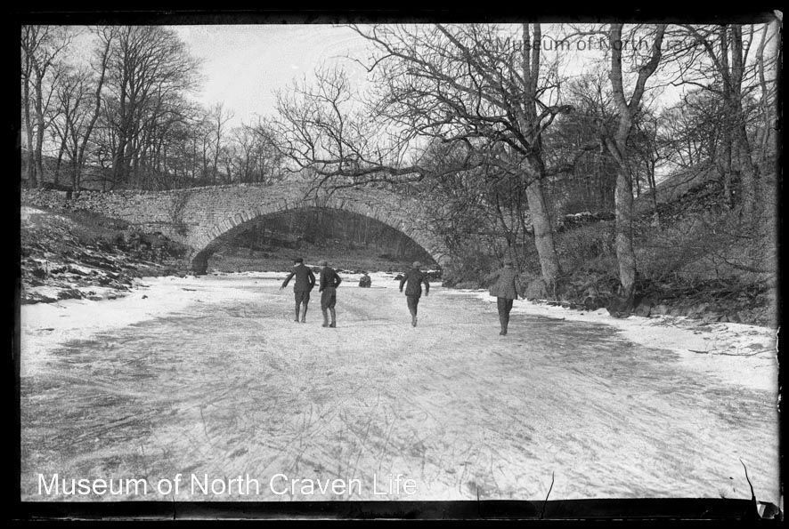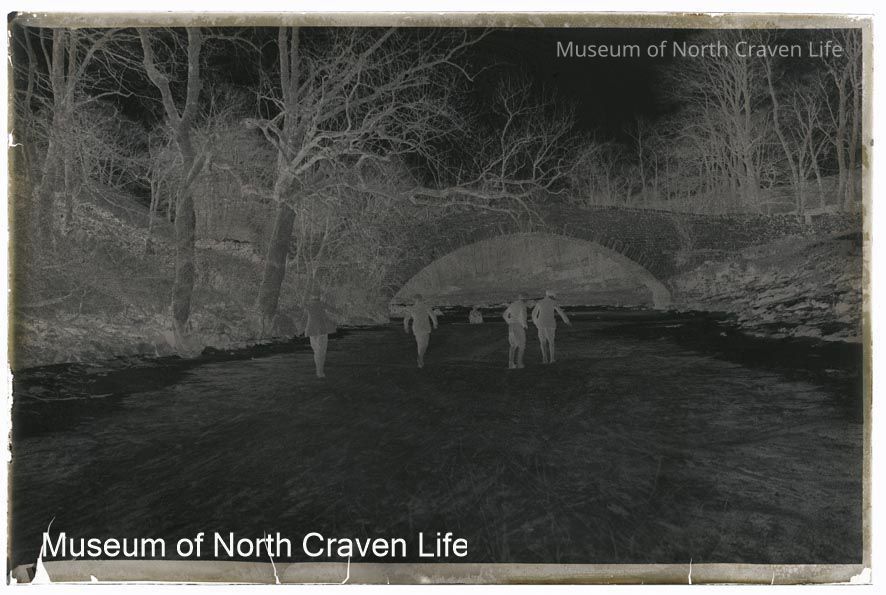 A half-plate gelatin silver glass negative. A view of Stainforth Bridge in the winter with ice and snow on the ground. A group of people stand on the frozen River RibbleCollection