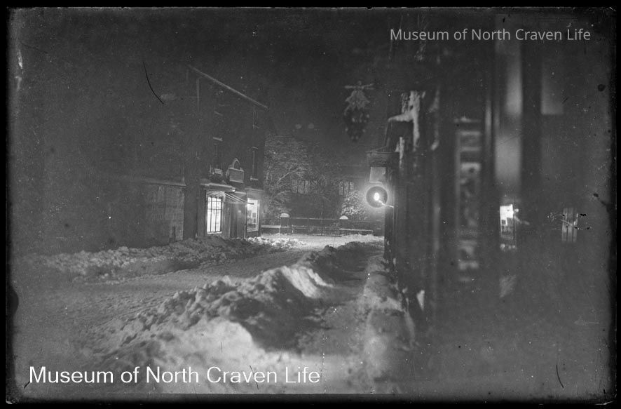 A half-plate gelatin silver glass negative. A view of Station Road, Settle at night in deep snow at nightCollection