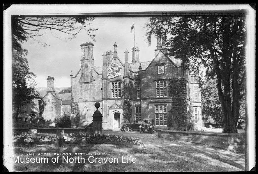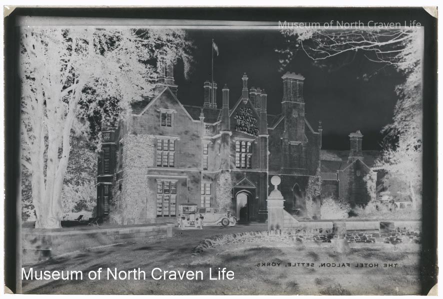 A half-plate gelatin silver glass negative. A view of the Falcon Hotel in Settle across the lawns. Two cars are parked in front of the entranceCollection
