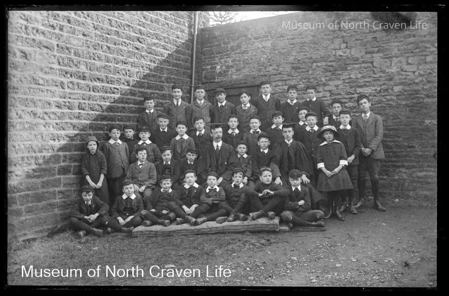 A half-plate gelatin silver glass negative. A group portrait of school children, standing and seated in front of a wall. A master sits in the middle of the group, wearing a gown and mortar boardCollection