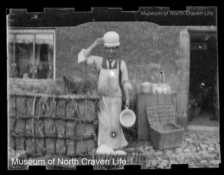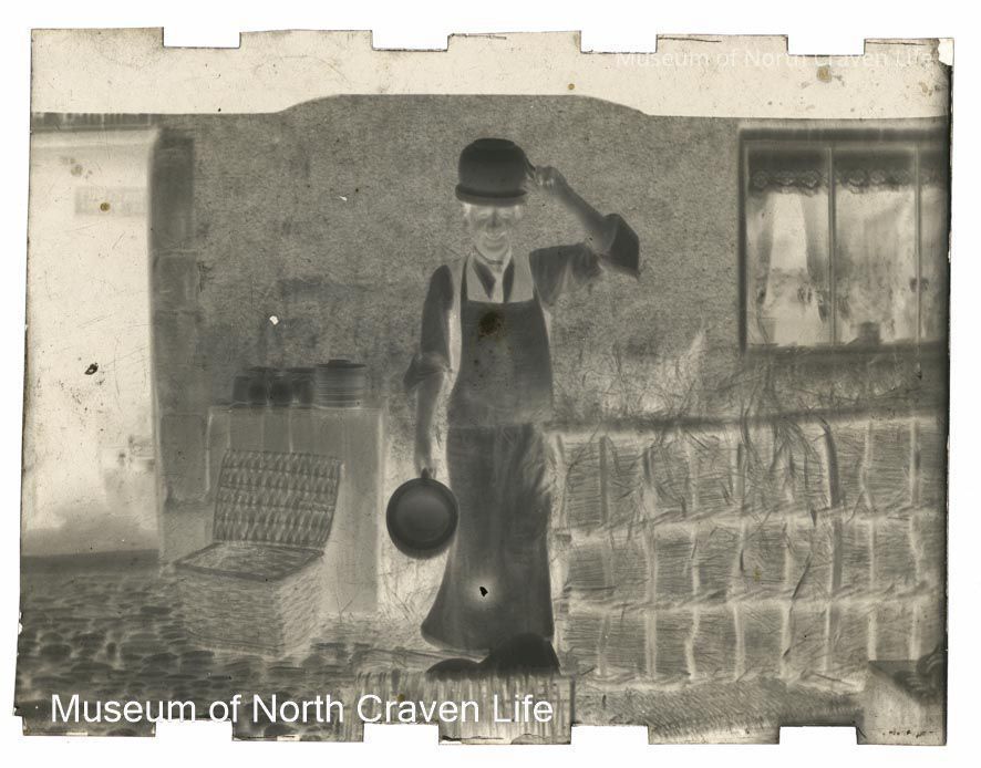A gelatin silver acetate film negative. A portrait of a man standing in an apron and holding a chamber pot on his head with his right hand while holding a second pot in his leftCollection