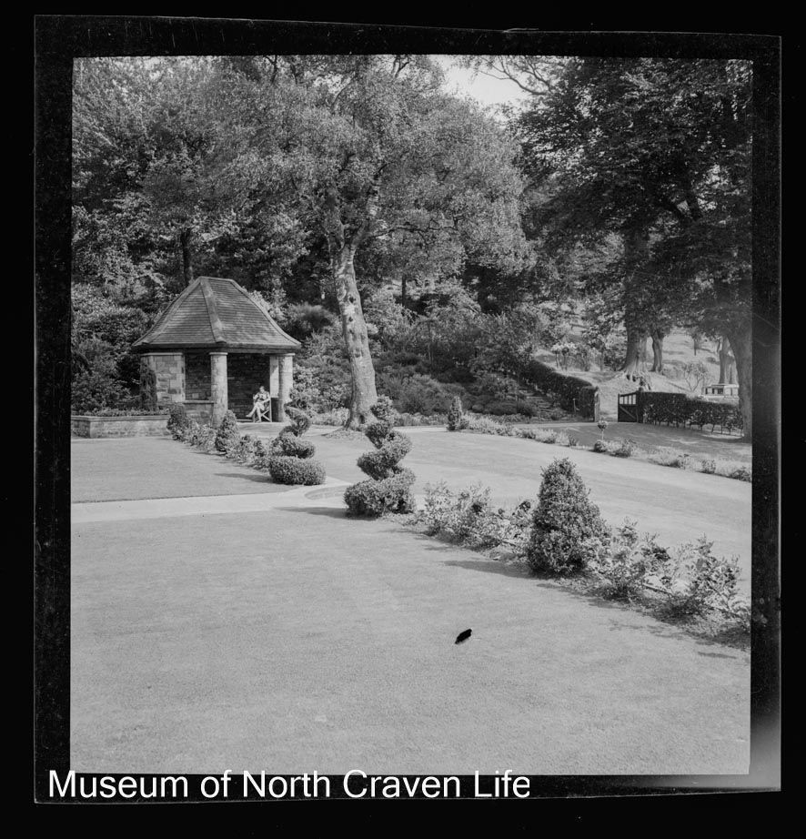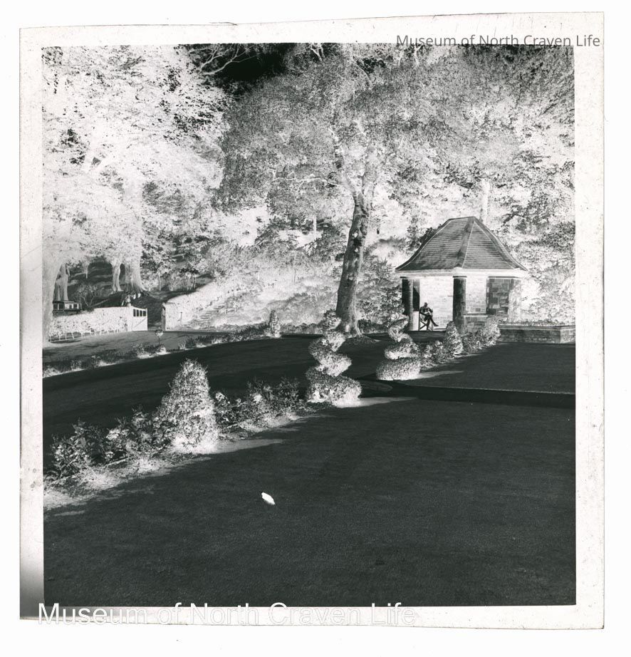 A gelatin silver acetate film negative. A view of the gardens with a summer house in the background in which a woman is seatedCollection