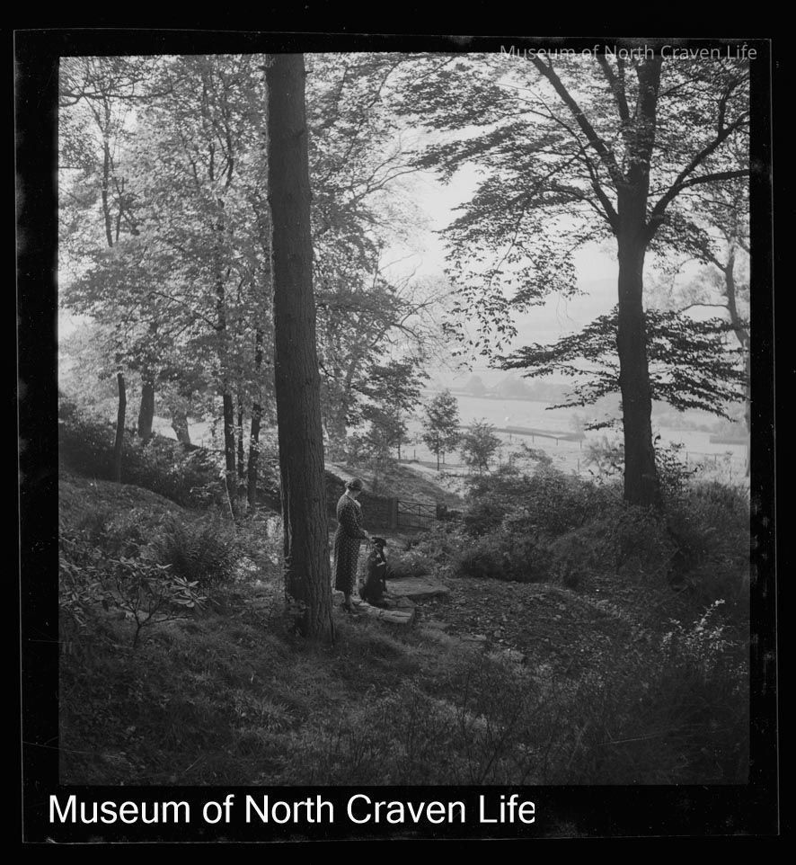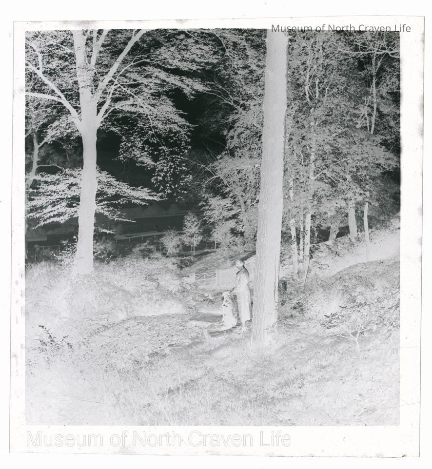A gelatin silver acetate film negative. A view of the stepped path under the trees in the grounds looking down. A woman and a dog appear at the top of the stepsCollection