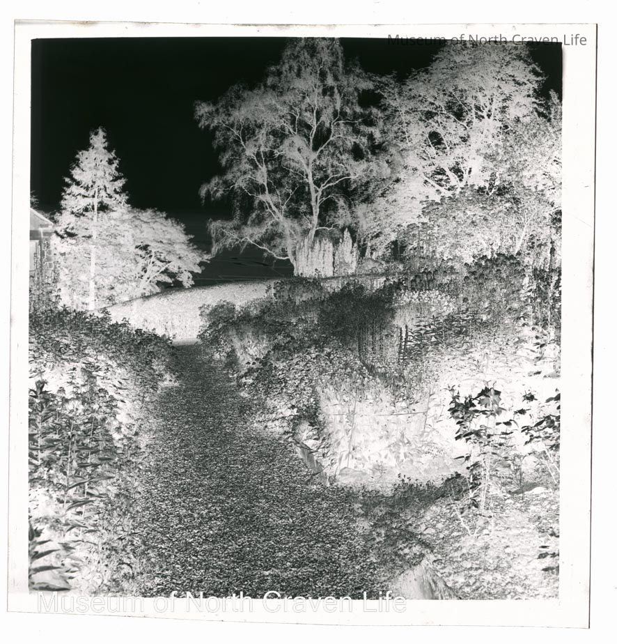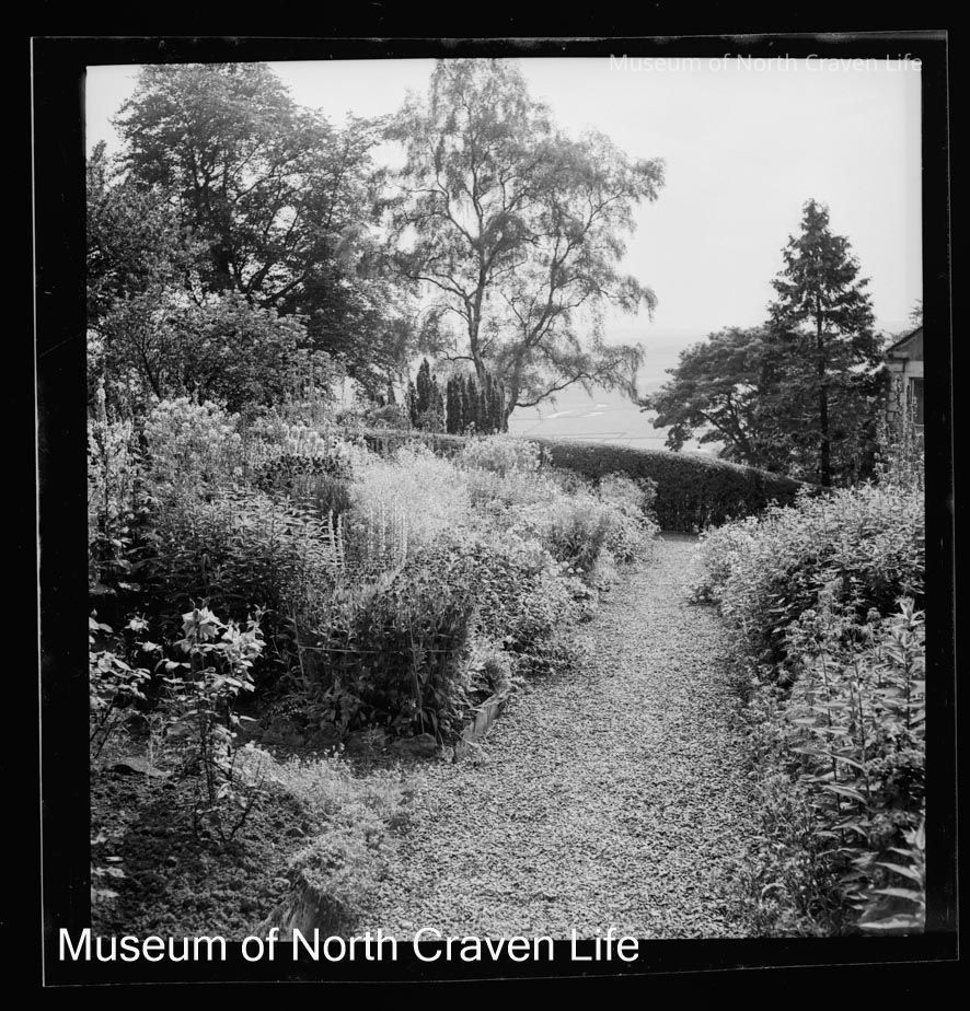 A gelatin silver acetate film negative. A view of the grounds. A path leads through flower beds towards a hedgeCollection